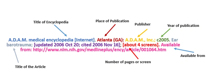 | Title of encyclopedia. Place of publication: Name of Publisher; year. Title of article; [updated YYYY Mon DD; cited YYYY Mon DD]; [# of pages or screens]. Available from: URL |